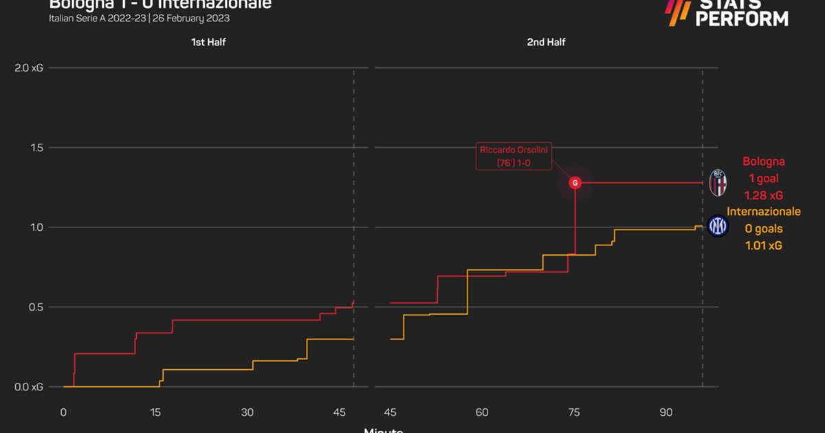 Inter accumulated just 1.01 xG (expected goals) to Bologna's 1.28 as Skorupski enjoyed a relatively comfortable 90 minutes between the sticks before watching Orsolini secure all three points for his team.