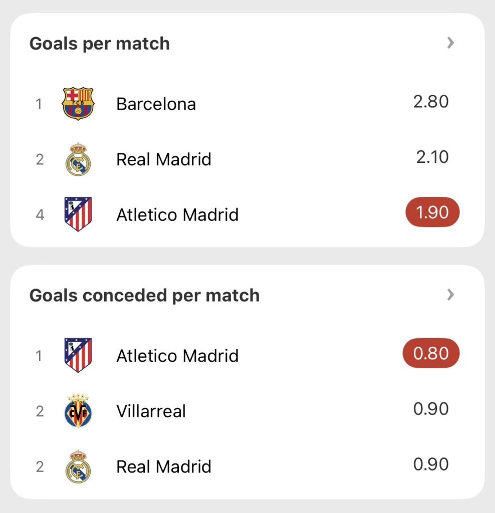So far this season, Atlético have conceded just 11 goals in LaLiga, fewer than any other side in the league. Simeone’s side have also shown signs of improvement going forward in recent weeks, with only Real Madrid and Barcelona creating more big chances, shots on target, and expected goals per game.