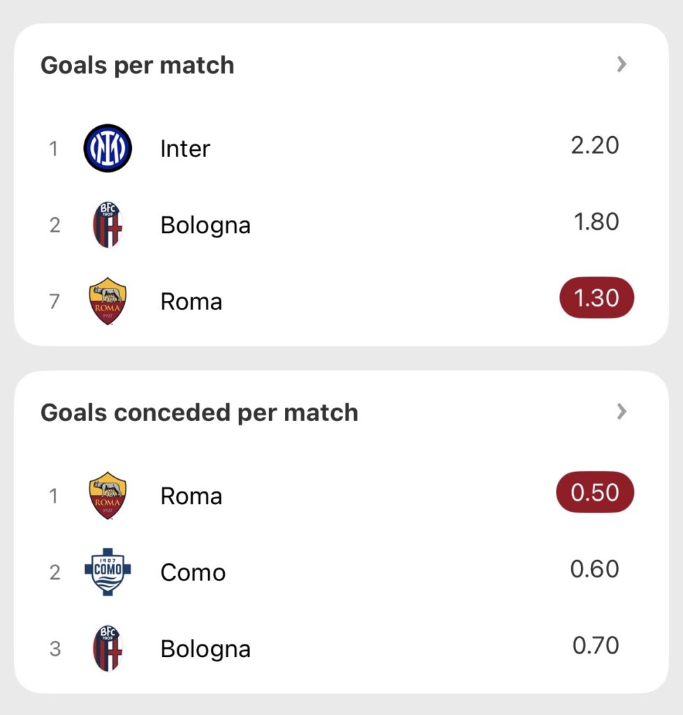 Roma aren’t free scoring, far from it. They’ve only managed to bag 15 league goals from their 12 games, the least of the six sides currently sitting in the European spots, and 11 fewer than fourth placed Inter Milan.