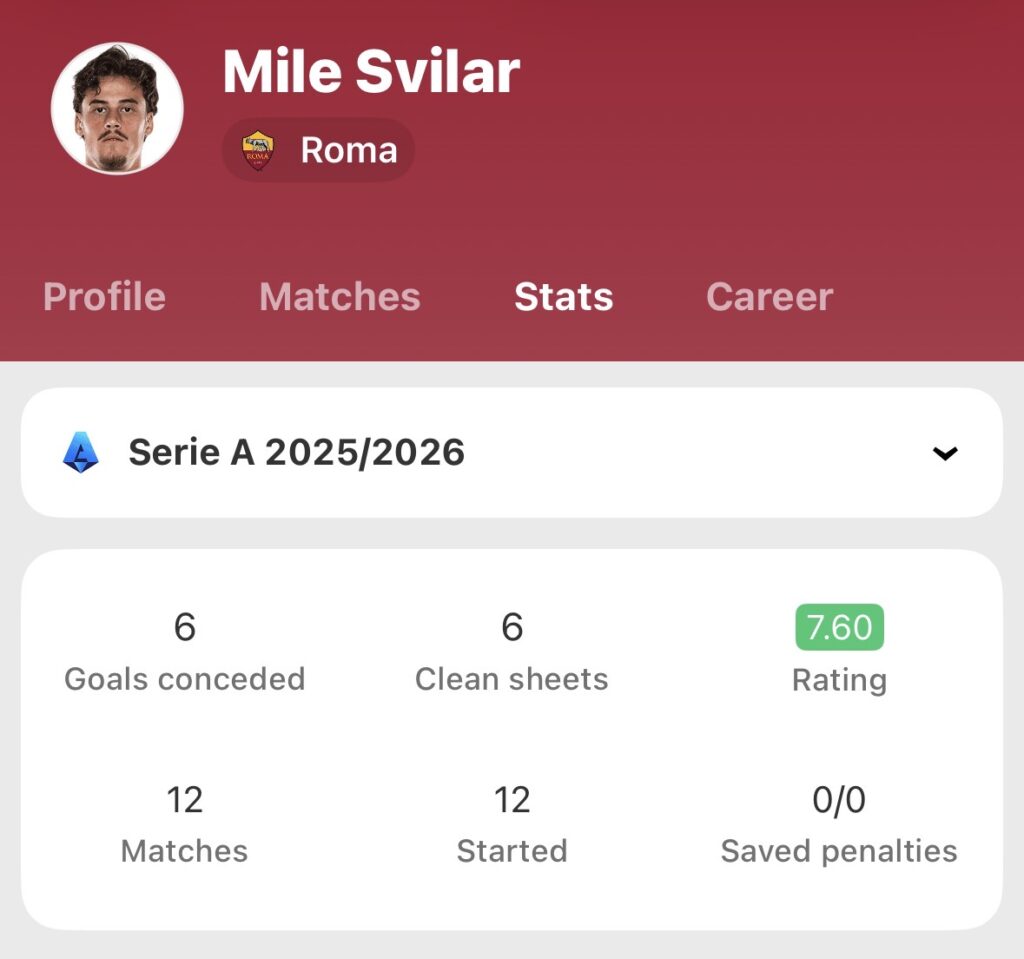 Speaking of the big Serbian, he is currently FotMob’s highest rated player in the Roma squad. We’ll pause for applause… Svilar is finally living up to the hype that he was getting as a youngster at Anderlecht, and he’s probably the best ‘keeper in Italy at the moment.