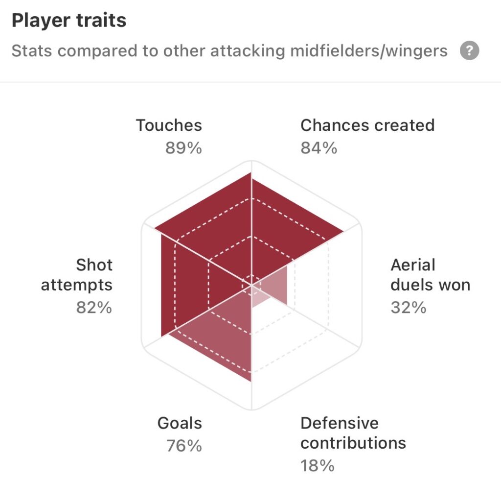Perhaps Soulé’s most overlooked asset is his work rate. He never stops, constantly hunting down opposition defenders and force mistakes, winning possession in the final third 14 times, making 55 recoveries, and winning 42 duels. He’s a little Jack Russell of a number ten.