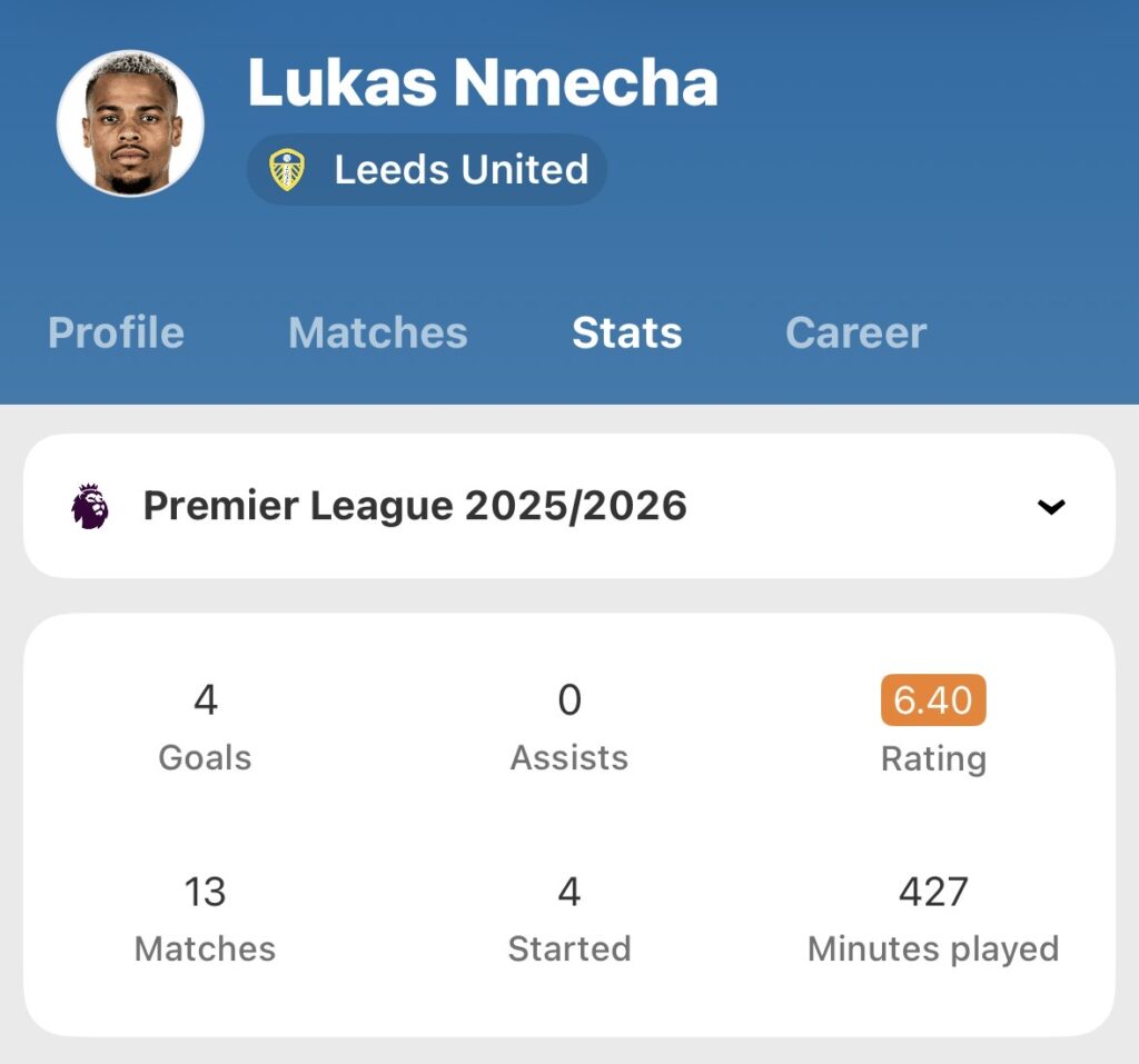 Goals are Leeds’ biggest issue. They only have seven different goal scorers so far this season and Nmecha is the only one that has more than two. Only rock-bottom Wolves have scored fewer goals than their 13.