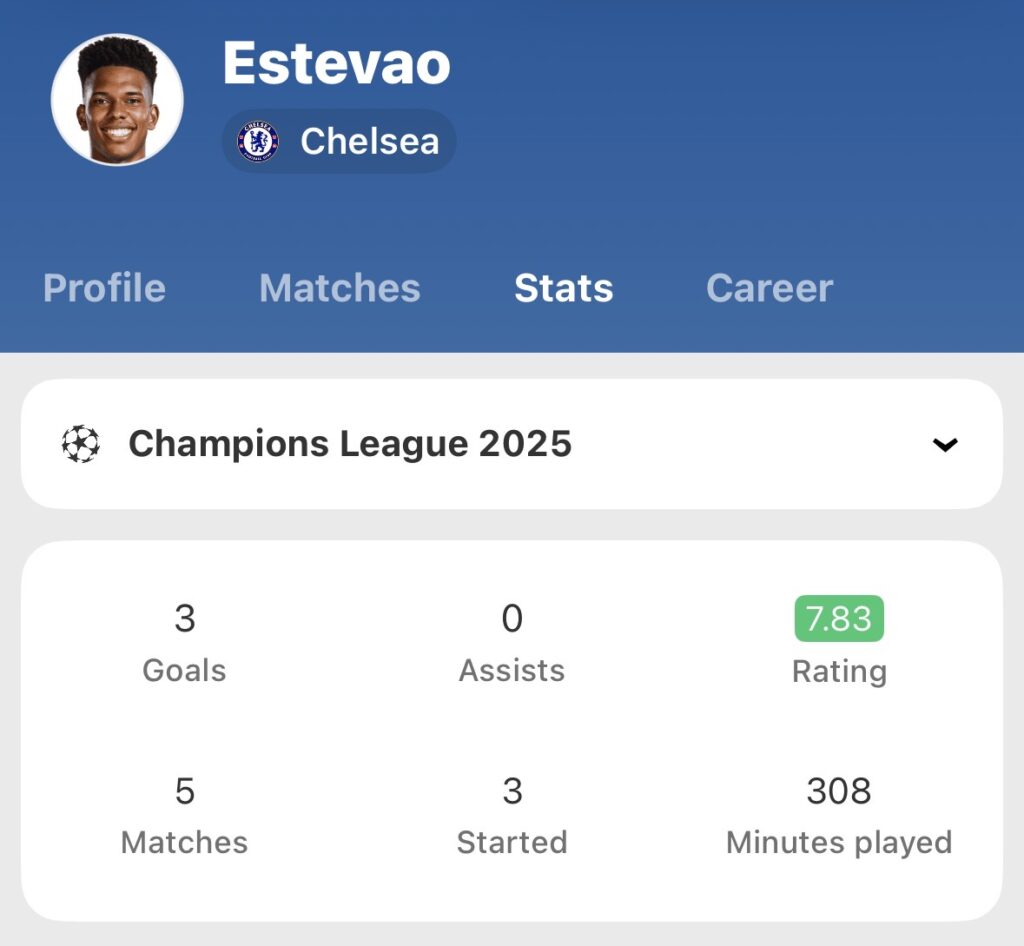 The Brazilian has taken to Europe’s premier club competition better than even he would have expected, and with an xG of 2.64, 14 attempts on goal, and a conversion rate of 21.43%, Estêvão is already Chelsea most important attacking threat.